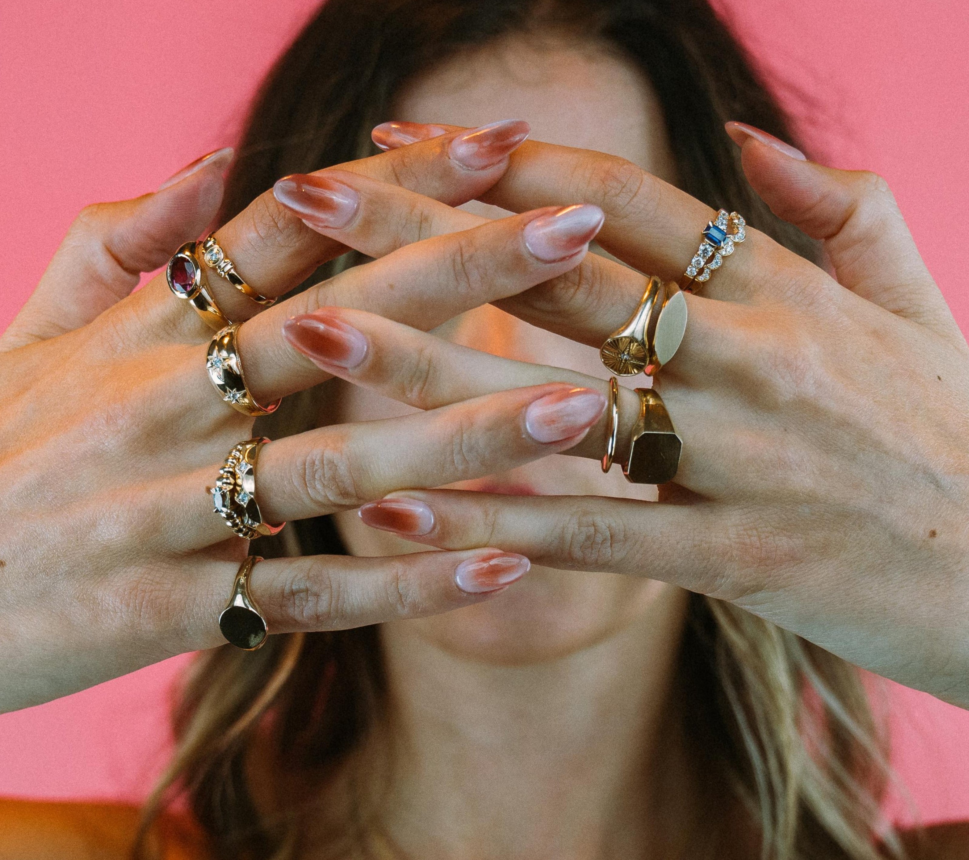 Rings with distinct forms, from classic profiles to more sculptural pieces.